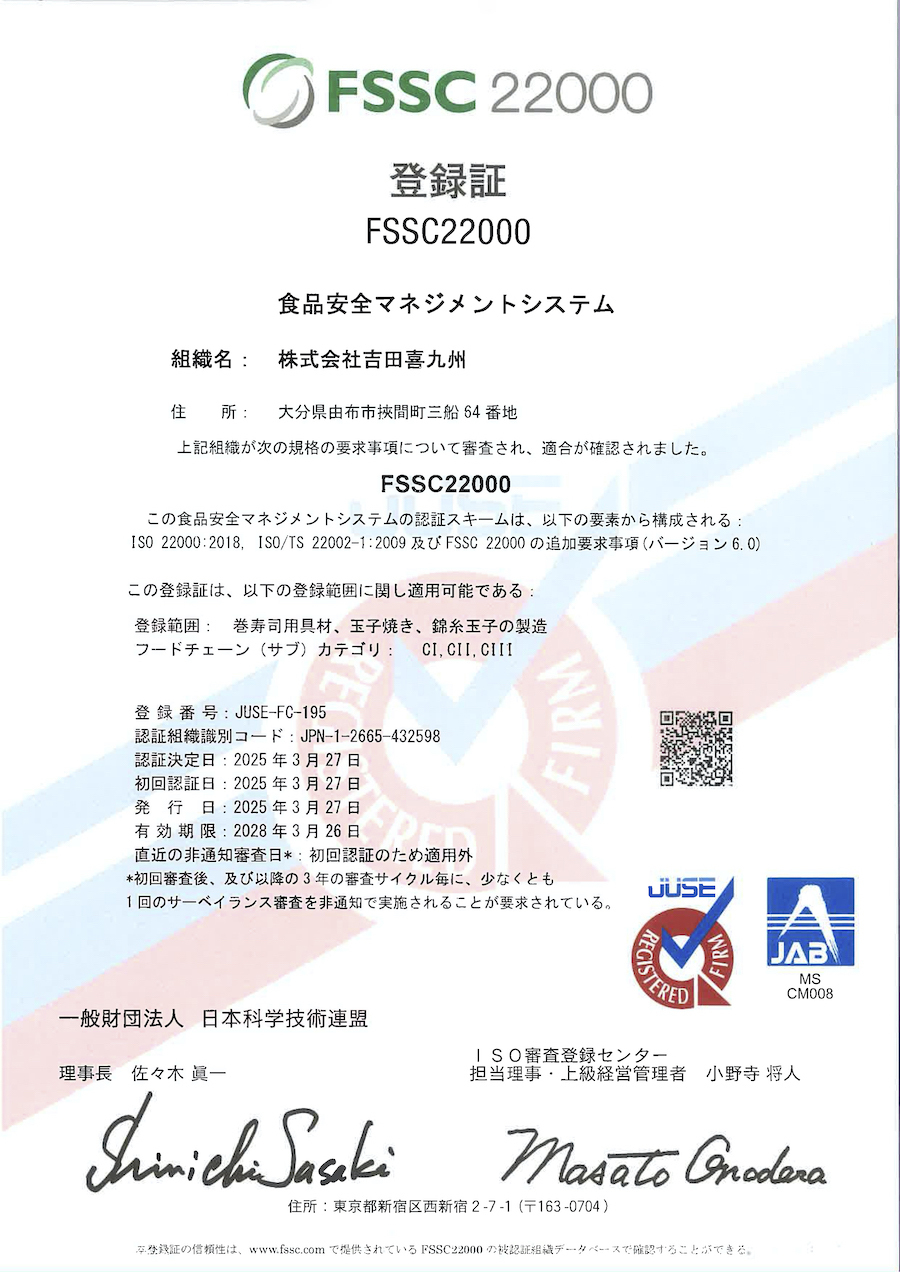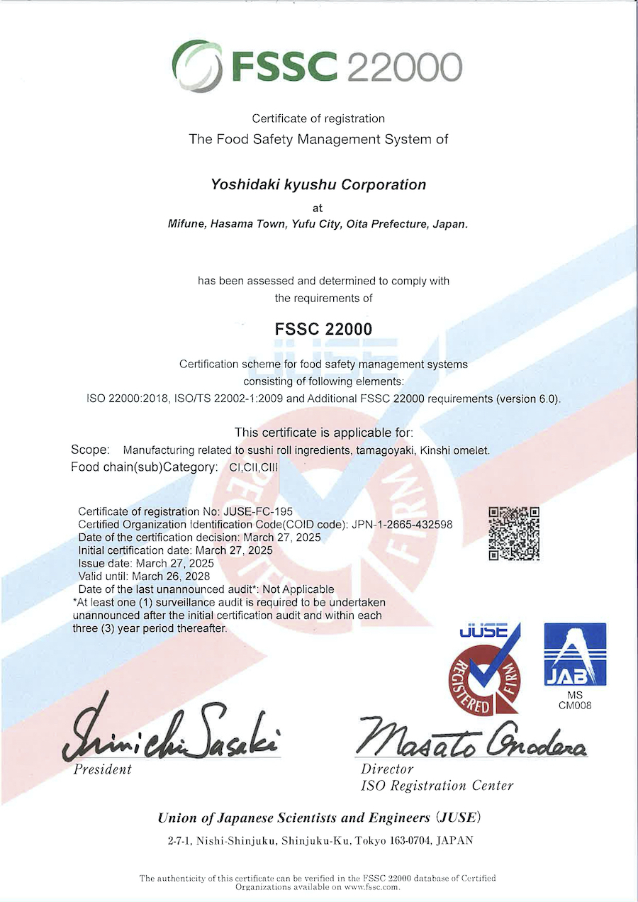 「FSSC22000」とは、Food Safety System Certification 22000の略で、安全な食品を製造する、仕組み作りのための認証規格です。食品安全の認証規格FSSC22000認証を取得することで、高水準の食品管理ができるシステムを確立することができ、業務効率の改善や組織体制の強化、業務継承の円滑化といった内部的なメリットに加え、認証取得による他社との差別化や海外企業との取引の拡大といった外部的なメリットがあります。FSSC22000を取得し、以下食品安全基本方針の基、安全な食品を製造していきます。